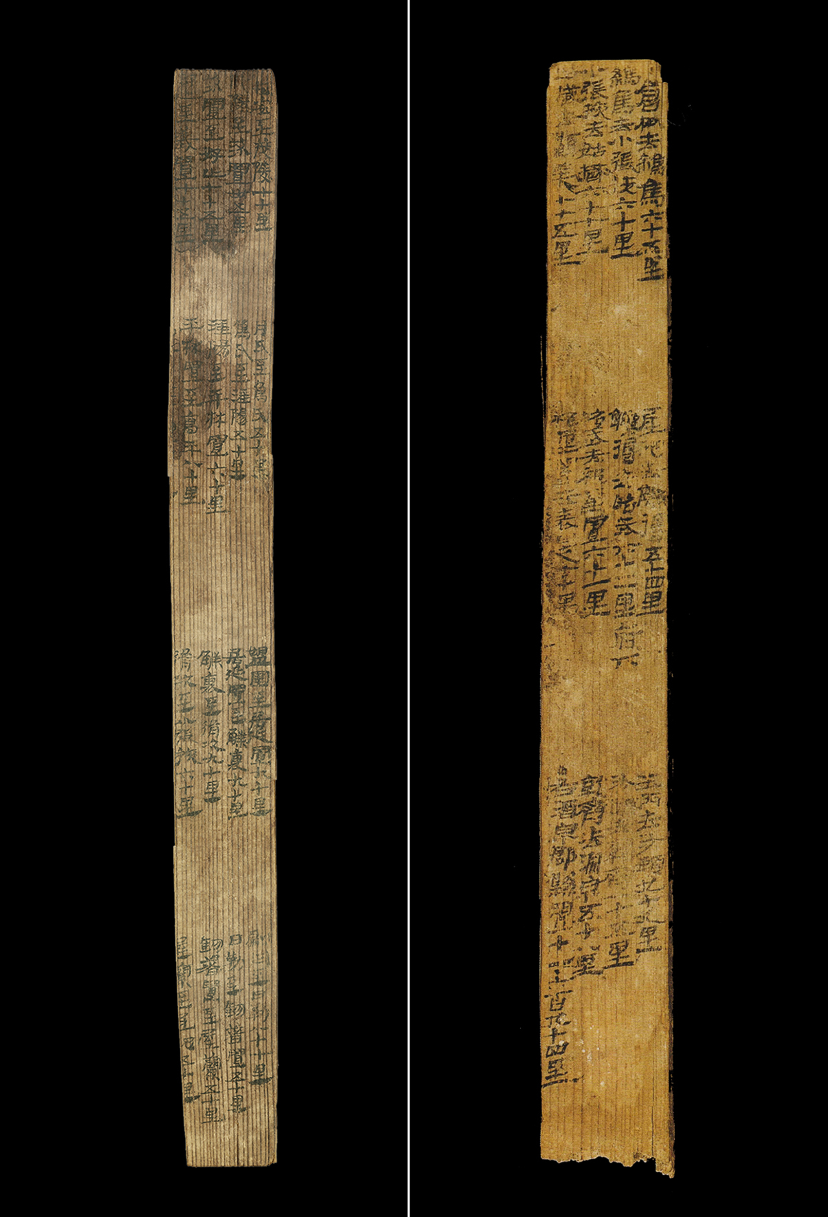 拼版照片:漢簡《居延里程簡》(左圖)和《懸泉里程簡》。1974年出土于今內(nèi)蒙古自治區(qū)額濟(jì)納旗破城子遺址的“居延里程簡”,詳細(xì)記載了從漢代長安出發(fā)至張掖郡20個驛置名稱及間隔里程。1990年出土于敦煌懸泉置遺址的“懸泉里程簡”,記載了河西走廊地區(qū)武威郡到敦煌郡12個驛置的詳細(xì)信息。新華社發(fā)(甘肅簡牘博物館供圖)