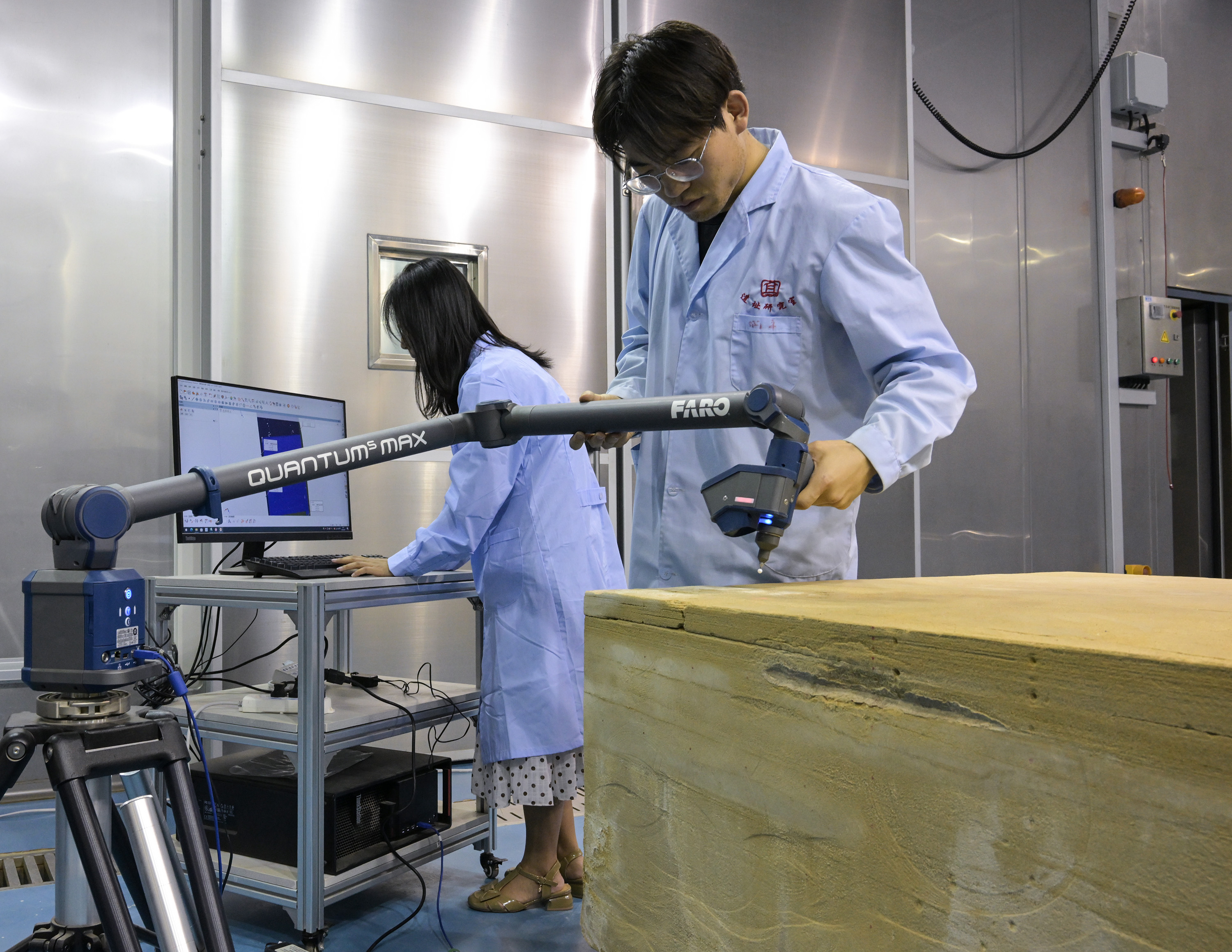在敦煌研究院多場耦合實驗室中,工作人員正在對慶陽北石窟寺砂巖樣品進(jìn)行三維掃描分析(2023年8月3日攝)。新華社記者 李賀 攝