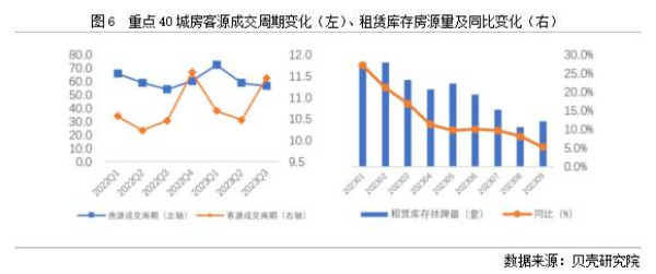 依據(jù)貝殼研究院數(shù)據(jù)監(jiān)測,全國重點(diǎn)40城2023年三季度房客源成交周期分別為56.7、11.5天,房源成交周期環(huán)比減少2.1天,同比增加2.7天;客源成交周期環(huán)比延長1天,同比延長1天。隨著個人租賃房源供應(yīng)的增加,疊加保障性租賃住房、市場化集中式租賃房源的增加,個人業(yè)主出租房源出租速度減緩。從庫存房源來看,2023年1-9月租賃庫存房源量均呈現(xiàn)同比增加的趨勢,與此同時,租客租房面臨的選擇項增多,租客對于租賃房源可選類型和房源量均有增加。