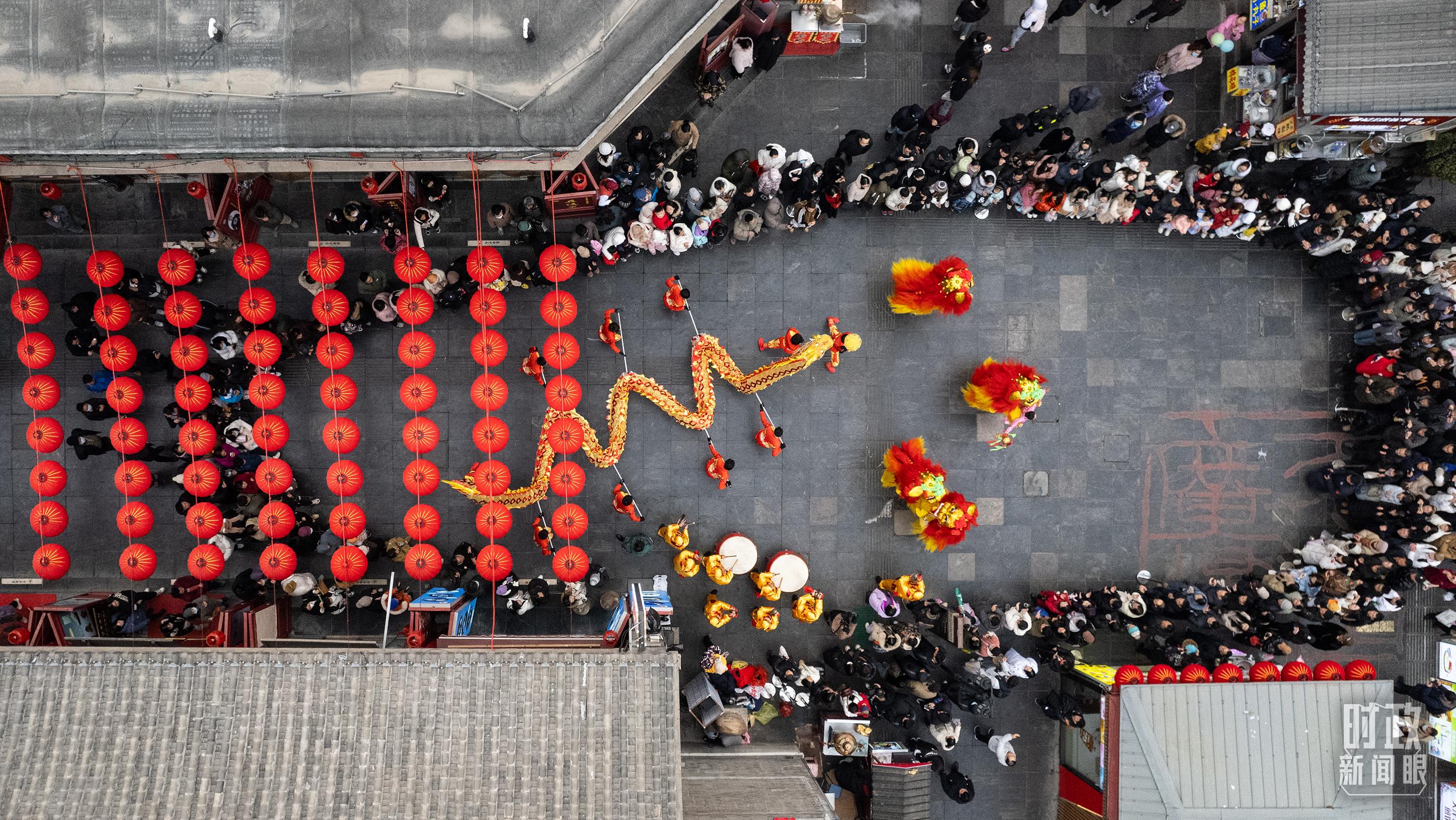 △天津古文化街上的舞龍舞獅表演,喜氣騰騰。(總臺國廣記者李晉拍攝)