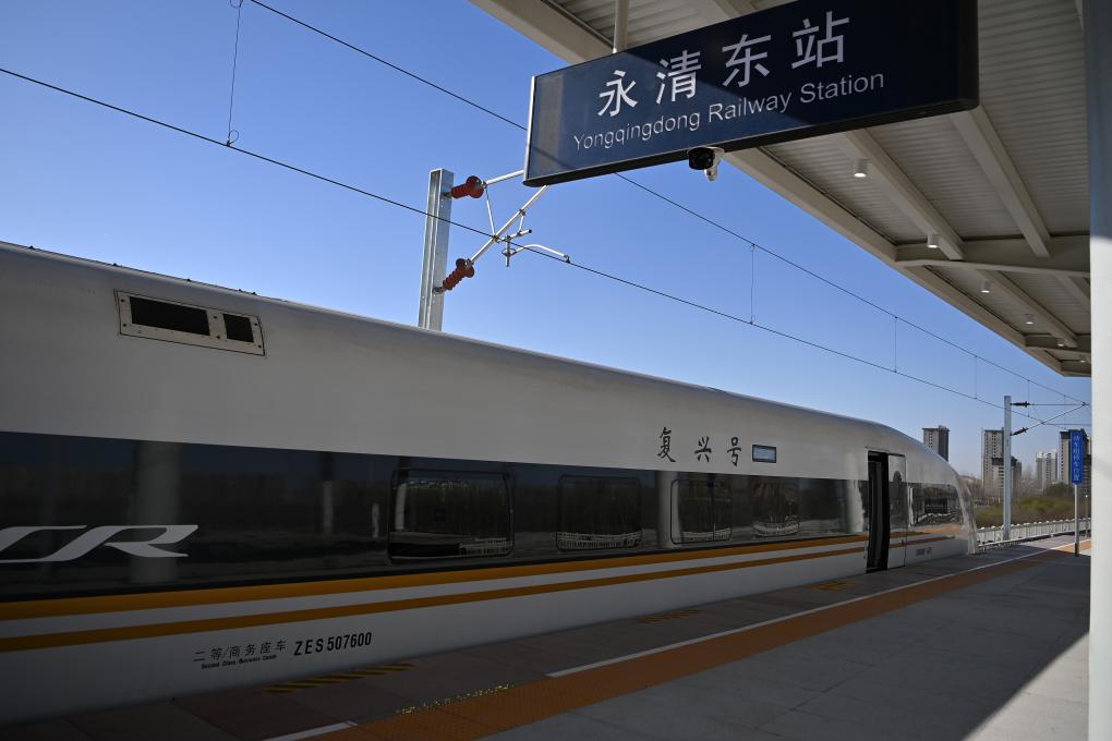 一輛復(fù)興號(hào)動(dòng)車組列車??吭诮蚺d城際鐵路永清東站。新華社記者 李然 攝