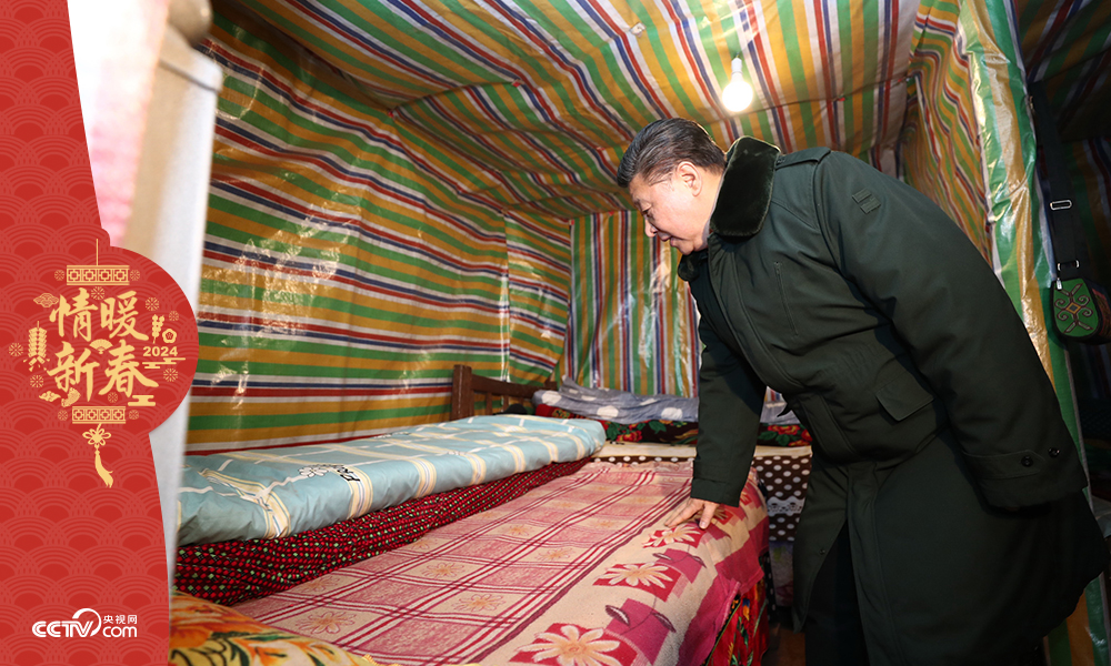 在貧困戶吉好也求家的土坯房里,總書記彎下腰,關(guān)切地掀開床褥、摸摸被子,看看夠不夠厚實(shí)。