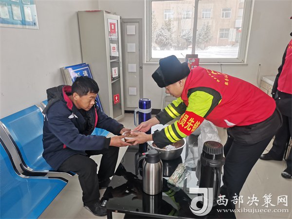 這有小米粥、炸油餅,雞蛋還熱乎著……”榆靖分公司志愿者暖心地喊著話。“行動是最好的破冰劑”,志愿者們?yōu)楦咚贉袈每退腿ナ澄?,頂風冒雪分發(fā)給滯留在收費站的司乘人員。一件件穿梭在寒風中的“紅馬甲”此刻成為了冬日里最美的“志愿紅”,讓群眾在寒意逼人的天氣里感受到了一份特別的溫暖。大家紛紛表示感謝,“熱粥、小菜、松軟的饅頭下肚,全身都熱乎了。”一名滯留司機真誠地感激道。