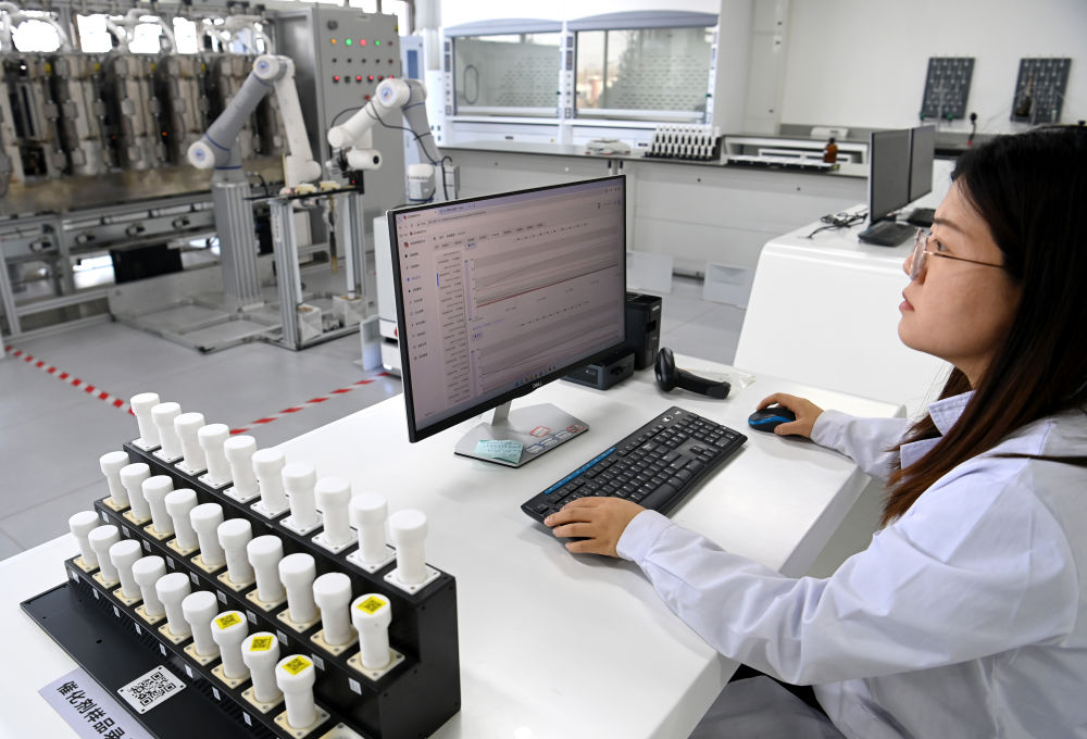 2024年2月28日,工作人員黨小梅在陜西榆林中科潔凈能源創(chuàng)新研究院基于人工智能的高通量催化反應研究平臺實驗室進行實驗。新華社記者 鄒競一 攝