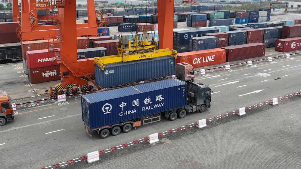 2024年3月1日,在天津港北疆港區(qū)C段智能化集裝箱碼頭,起重機搬運集裝箱。新華社記者 單宇琦 攝