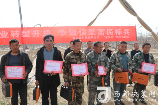 西部決策網(wǎng)訊 近日,黃龍縣果業(yè)中心、三岔鎮(zhèn)人民政府在三岔鎮(zhèn)木昌橋村聯(lián)合舉辦“金剪刀”技術(shù)大比武。本次比賽特邀請西北農(nóng)林科技大學園藝學院研究員,博士生導(dǎo)師,國家蘋果產(chǎn)業(yè)技術(shù)體系延安綜合試驗站站長鄒養(yǎng)軍,以及延安市和洛川縣等地的果業(yè)專家擔當評委。來自全縣4個涉果鄉(xiāng)鎮(zhèn)的優(yōu)秀果農(nóng)代表11人以及果業(yè)中心技術(shù)員3人參賽。