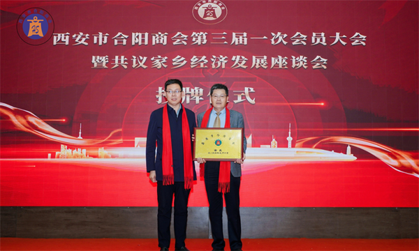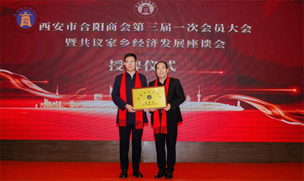 西安市合陽(yáng)商會(huì)會(huì)長(zhǎng)賈申龍先生和監(jiān)事長(zhǎng)劉自力先生為副會(huì)長(zhǎng)單位授牌。